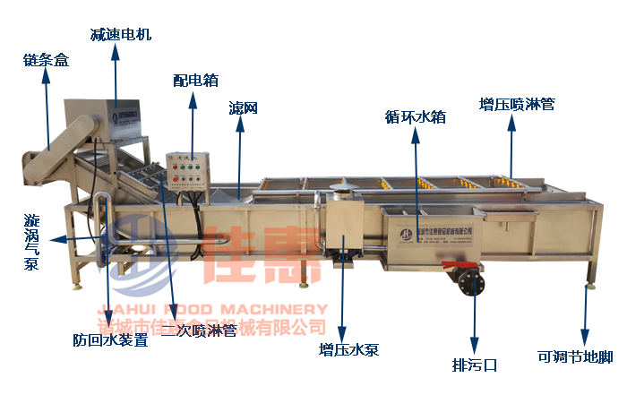 3、高壓噴淋氣泡清洗機設(shè)備中設(shè)有氣泡發(fā)生裝置(漩渦氣泵的壓力使水產(chǎn)生強烈翻滾的氣泡),使物料在水中呈翻滾狀態(tài),從而達到清洗果蔬的效果。具有洗潔凈高、節(jié)能、節(jié)水、穩(wěn)定可靠等特點。