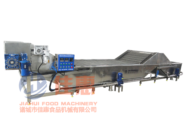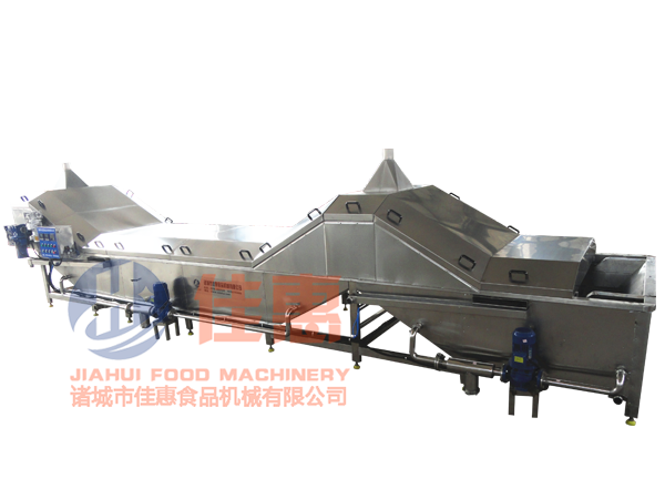 3、設備帶有自動恒溫裝置,雙層保溫材質,漂燙的溫度在常溫-100℃之間可調,加熱可以采用電加熱和蒸汽加熱兩種方式。 4、當煮制機工作時,煮制機內的水能循環往復有序流動及充分混合,趨使煮制機內水溫均衡一致。既達到提高物料預煮質量的均勻性和穩定性的目的,又可避免因煮制機內局部溫度過高而燙傷物料。 5、物料經前段傳送帶輸送至預煮區域,預煮槽底部設有蒸汽管道,管道上設有蒸汽出口,通入蒸汽后蒸汽能夠均勻分散在蒸汽槽內,使槽內溫度均勻無死角。
