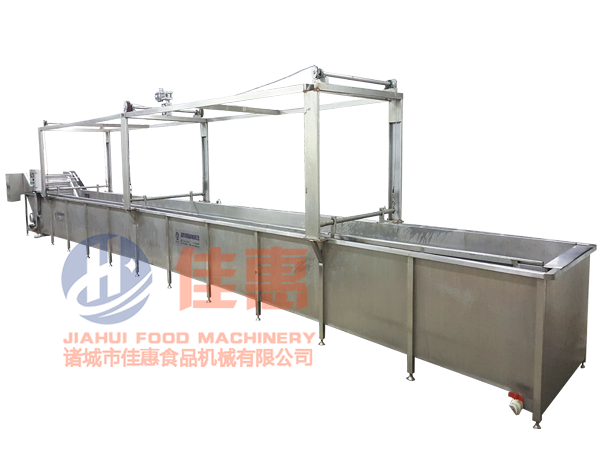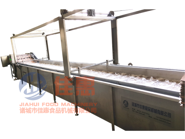 1、主要用于冷凍的肉類、魚類、分割禽肉類、冷凍果蔬的連續解凍。 2、節約水資源,水可多次用于解凍多種產品。 3、節約人工,只要一個工人就可以完成(1T/h-10T/h)的產量。 4、可配套設備連接自動鹵制線,油炸流水線。 工作原理: 將凍肉等物料放進加滿水的解凍池,用氣泡將水翻騰,從而達到快速解凍的目的。隨著凍品的解凍,傳送帶上的產品向出料方向傳送。 設備示意圖: