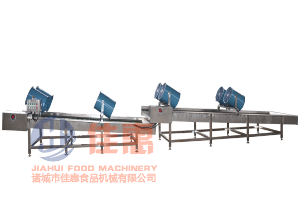 把已鹵煮、油炸過的物料(豆干、油炸食品)倒入振動篩上,通過振動篩的振動,自動分散攤開,然后自動進入攤涼機,攤涼機有強流風(fēng)冷風(fēng)機,可以給物料進行強制降溫,攤涼機具有自動翻轉(zhuǎn)的功能,可以把豆干的兩面進行風(fēng)吹除水、降溫,直至物料冷卻降溫。