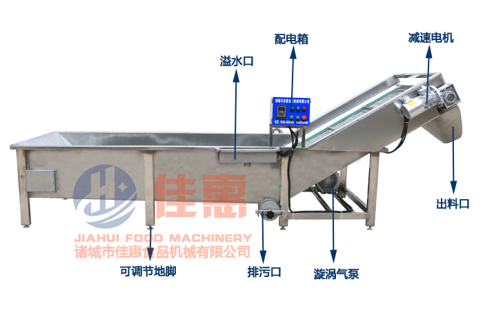 1、破袋挑選機設備除電機、軸承等標準件外均采用不銹鋼SUS304/2B材料制作,完全符合出口食品衛生要求。設備中設有氣泡發生裝置,使物料呈翻滾狀態,去除包裝袋表面油垢、污漬。油污漂浮物可以從溢流槽溢出,沉淀物從排污口排出,以達到清洗的目的。同時,包裝袋破損的產品會浮在水面上,被收集濾網收集,以防進入之后流程裝箱后造成二次污染。