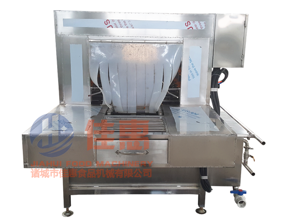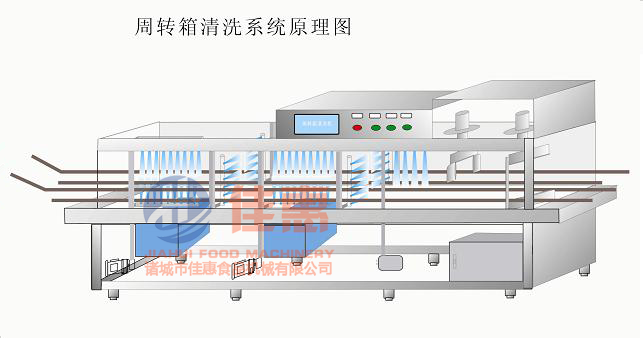 需清洗的周轉筐由不銹鋼鏈條輸入噴淋式洗筐機中,依次通過加溫老堿水→高壓熱水→常溫自來水→消毒水→常溫風刀去水等多道工 序,將筐子清洗干凈,同時完成殺菌及風干;特殊筐子清洗時可在熱堿水清洗段后加配毛刷,對筐子底部及左右兩側進行刷洗, 提高清洗效果。