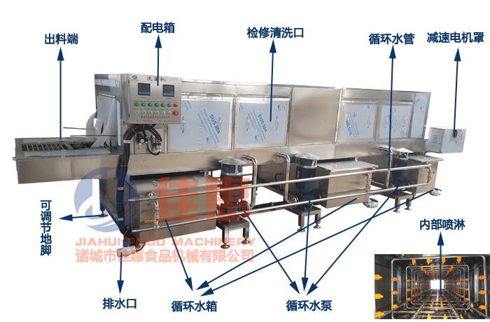 2、設備有熱堿水噴淋段、毛刷刷洗段、熱水噴淋段、清水噴淋段、消毒水噴淋段、烘干段等幾部分組成,其中毛刷刷洗段、消毒水噴淋段及烘干段可根據客戶要求定配。