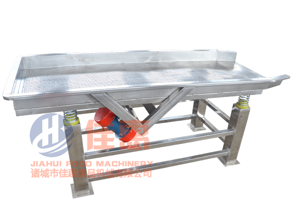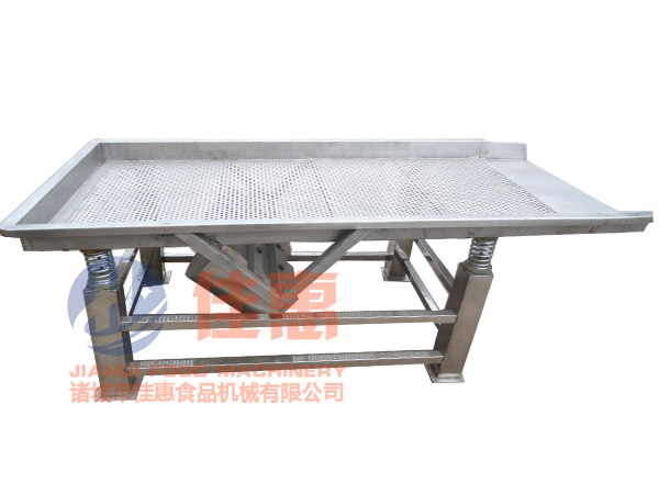 本機設備除動力部分外,全部采用優(yōu)質(zhì)的SUS304不銹鋼制作。整機采用SUS304不銹鋼制造,機架方剛采用100*100mm(3mm厚)的不銹鋼焊接制造,篩面采用2mm不銹鋼沖孔制作,下部增重加強,底部配置有接水盤,可以快速收集殘水集中排放。采用偏心電機帶動篩面運動。 2、主要工作原理:物料由入料端進入,經(jīng)過振動偏心裝置震動前進,能更好的實現(xiàn)物料表面除水,然后進入風干線或直接裝箱,大大縮短物料的干燥時間,提高產(chǎn)品的工作效率,該機也可用于物料的篩選、分級、布料。 設備特點: 1、振動瀝水機是食品生產(chǎn)線環(huán)節(jié)當中,簡單而有效的流水設備之一,我廠生產(chǎn)的振動瀝水設備吸取了國外先進優(yōu)點,融入多樣新技術、新工藝,是當前國內(nèi)外應用廣泛,食品加工處理的一條完整的自動化生產(chǎn)線。經(jīng)國內(nèi)外百余家企業(yè)的實際使用證明:加工通用性廣,處理效果好,投資省,節(jié)能等特點,是理想、經(jīng)濟的生產(chǎn)線設備之一。 2、振動瀝水機采用全不銹鋼制造,由激振器產(chǎn)生振動源,使物料在篩網(wǎng)上拋起等以此起到震動瀝水等作用,此設備建議配入流水線作業(yè),效果更佳。主要用于脫水蔬菜、糧食、塑料、化工、醫(yī)藥等行業(yè)。 3、振動瀝水機主要適用于物料表面水分的去除:可有效去除水浴殺菌后食品包裝袋上殘留的大量的水滴,同時可以起到平攤布料均勻的效果。 通過震動把包裝袋上殘留的水瀝掉,也可用于物料的篩選、分級、布料。