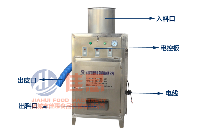 大蒜脫皮機采用碳鋼和不銹鋼(傳動件除外)兩種材質制作,以空氣壓縮機為生產動力,通過電、氣控制使大蒜導料、脫皮、出料自動完成。