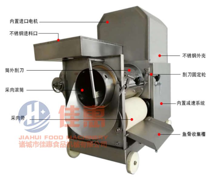設備簡介: 魚肉采肉機又叫魚肉采取機、魚刺分離機、魚骨分離機、骨肉分離機,它可以輕而易舉的將魚肉和魚刺、魚皮分離開來,是做魚丸、魚豆腐等魚肉制品必備的加工設備。電動機保修一年,每分鐘1400轉,可以將魚肉、魚骨、魚皮分離開,采取出干凈的魚肉。按整條魚的比例來算,一斤魚可以采去6兩魚肉,采肉量達到90%。這款機器不僅能夠采魚肉,還可以采蝦肉、泥鰍肉等。該機一小時可采肉量100斤到200斤左右,不管是大魚還是小魚都可以采,采肉孔徑3.5mm。 結構原理及特點: 傳動方式: 電動機通過三角帶——齒輪——帶輥,分別把動力傳遞給聚胺脂尼龍帶及不銹鋼采取筒,并使其運轉。 采取魚肉的過程: 人工把待加工的魚先去掉魚頭和取出魚肚中的內臟;對大魚,則需將魚剖分成兩半,并漂洗干凈。隨后將待采取的兩片魚片投入到料斗內(魚的剖分面朝向采取筒,背部貼近尼龍帶),魚在尼龍帶的帶動下進入采取筒與尼龍帶的擠壓區。被分離的魚,在尼龍帶與采取筒之間的擠壓力的作用下,魚肉被擠壓通過采取筒上的小孔進入分離筒內,隨后人工再將進入采取筒內的魚肉碎粒刮到承接槽中。而魚皮及魚刺則被裝在機器上的刮刀從采取筒上刮下落在尼龍帶上,被尼龍帶帶入機器底部的收集槽中。尼龍帶與采取筒之間的壓力大小,是由位于機器頭部的尼龍帶的拉緊裝置來調節的。調節量的大小是根據魚種的不同而有所變化。可在生產實踐中進行人工調節。 工作原理: 魚肉采肉機裝有采肉桶和壓榨肉用的橡膠帶,利用滾動的采肉桶和傳動的橡膠帶的相互壓榨運動將魚擠入采肉桶內,而把魚皮、魚骨留在采肉桶外,由刮刀把它送出機外。 性能優點: 1、采肉機采用國內技術制造而成,具有省力省時省人工三大優點。 2、分離魚肉機內部設有節能電路,節約能源,非常環保。 3、該機設計合理,魚肉去刺機精悍創新,作業過程升溫低、效益高。 4、接觸食品部位及外觀部分均采用優質不銹鋼材料,符合國家食品衛生標準要求。尤其適用于衛生條件要求較高的專業食品加工企業使用。 5、分離魚肉機分離率高達百分之九十以上,且不傷魚肉的營養成分。 6、全自動魚肉分離機功率強大,分離速度快,可以大大提高生產效率。 7、魚肉采集機電機轉速強大,可以更好更快捷的分離魚肉;以先進的滾筒設計為基礎,使分離效果更加出色。 8、魚肉分離機在操作時可根據魚肉的大小來調節螺旋控制進口,以達到更好的分離效果,避免出現骨渣過多現象。 9、有適合店面,魚市場用的150型,也有魚制品加工廠用的大型魚肉采肉機,有200型,300型,350型,做出來的魚肉適合做魚餅,魚豆腐,魚糕,魚丸,魚餃等產品。 10、全自動魚肉分離機在分離魚肉時嚴禁將肢體伸入機器,以免發生危險。 11、魚肉采集機用途廣泛是魚丸,全魚宴等食品的必備設備;如果在使用過程中出現異常情況,應馬上停機檢查,再解除異常后再行使用。 適用范圍: 魚肉采肉機適用于海魚、淡水魚等各種魚類。大魚分割成段,小魚直接采肉。可將魚體中的魚肉和魚骨、魚皮、魚筋進行分離,達到提高原材料利用率、節約人工費用的目的,提高低值魚的經濟價值。 開采的魚肉可以直接用于生產各種魚糜制品:魚丸、魚面、魚膠、魚餃子等魚醬原材。 特別說明: 該系列設備可根據用戶的實際產品生產需要進行設計,也可以根據用戶的實際產能要求制作具體尺寸型號規格。 |