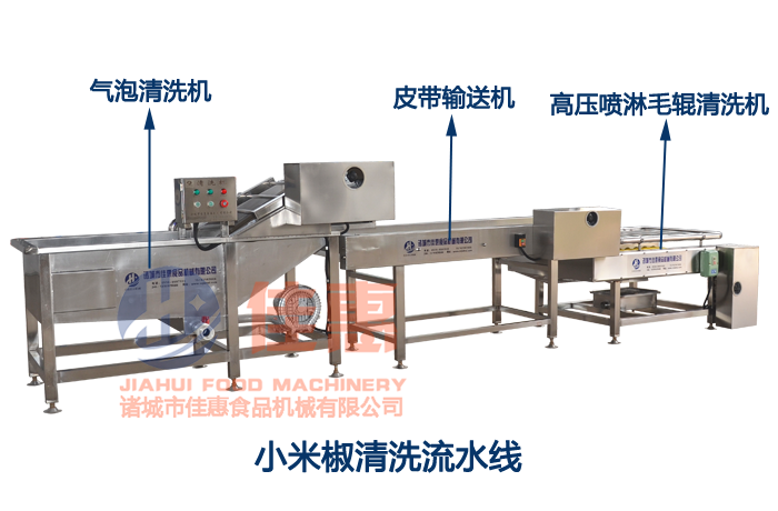 小米椒清洗流水線由氣泡清洗機、皮帶輸送機、高壓噴淋毛輥清洗機組成。