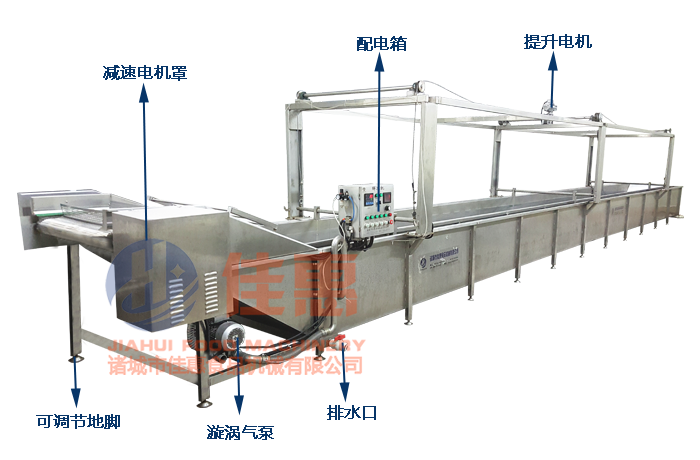 2、為保障解凍出來的產品干凈,在提升出料段設有冷水噴淋;為保障解凍槽里的水質干凈無雜質,在解凍槽外加儲水槽循環,使產品在解凍過程中,由產品帶入解凍槽里的雜質,經過外水槽循環沉淀,以減少對解凍槽清洗的次數。