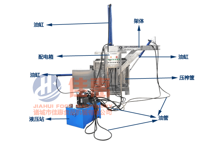 1、液壓壓榨機主要由機架、油缸、壓力油泵、壓蓋、電機、油箱、桶組合而成。